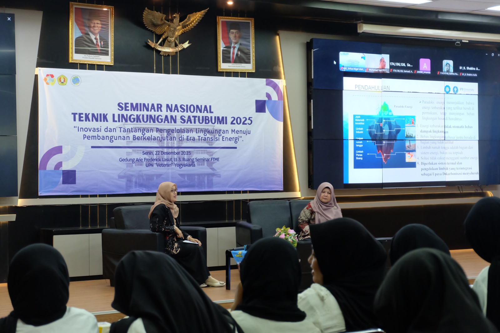 Telah dilaksanakan Seminar Nasional SatuBumi 2025. Seminar Nasional ini dilaksankan di Gedung Arie Frederick Lasut, Lantai 3. Ruang Seminar FTME UPN “Veteran” Yogyakarta. Dekan FTME, Prof. Dr. Ir. RM. Basuki Rahmad, M.T berkesempatan menyampaikan sambutan dalam acara Seminar Nasional ini. Mahasiswa maupun Dosen Teknik Lingkungan juga sangat antusias mengikuti serangkaian kegiatan Seminar Nasional yang diadakan pada hari Senin, 22 Desember 2025.