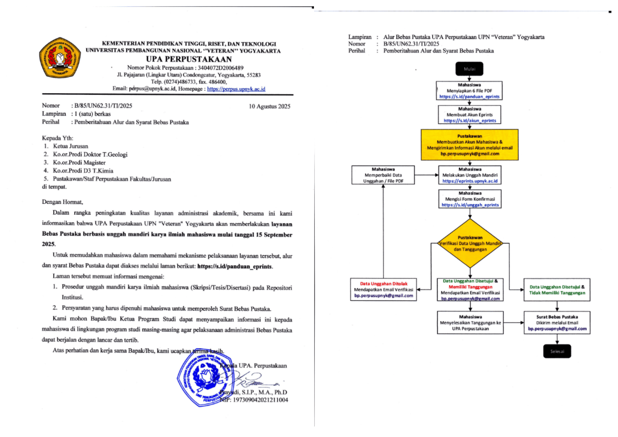 Dalam rangka peningkatan kualitas layanan administrasi akademik, bersama ini kami informasikan bahwa UPA Perpustakaan UPN "Veteran" Yogyakarta akan memberlakukan layanan Bebas Pustaka berbasis unggah mandiri karya ilmiah mahasiswa mulai tanggal 15 September 2025. Untuk memudahkan mahasiswa dalam memahami mekanisme pelaksanaan layanan tersebut, alur dan syarat Bebas Pustaka dapat diakses melalui laman berikut: https://s.id/panduan_eprints. Laman tersebut memuat informasi mengenai: