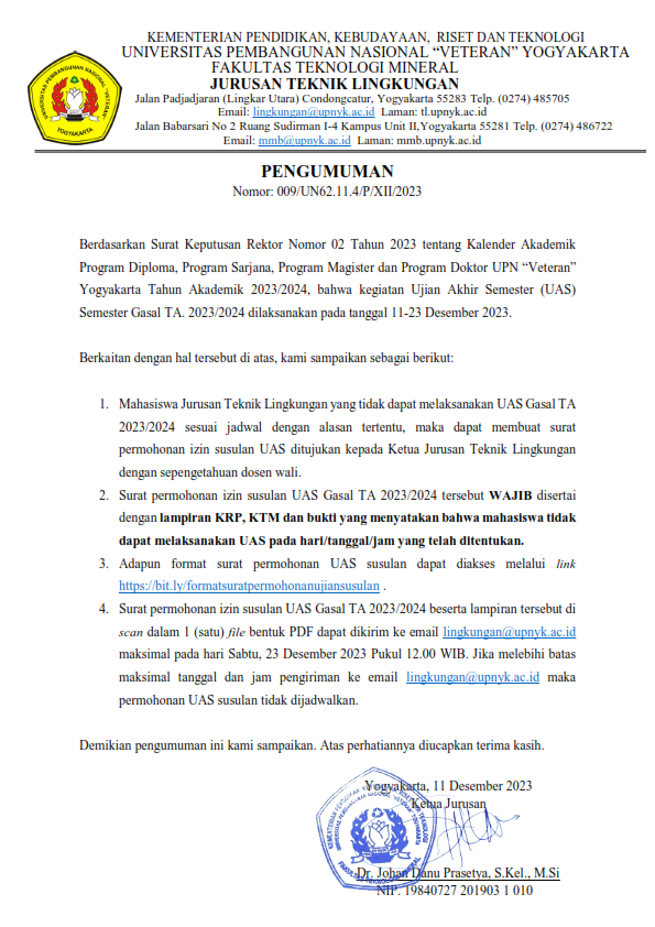1. Mahasiswa Jurusan Teknik Lingkungan yang tidak dapat melaksanakan UAS Gasal TA 2023/2024 sesuai jadwal dengan alasan tertentu, maka dapat membuat surat permohonan izin susulan UAS ditujukan kepada Ketua Jurusan Teknik Lingkungan dengan sepengetahuan dosen wali.